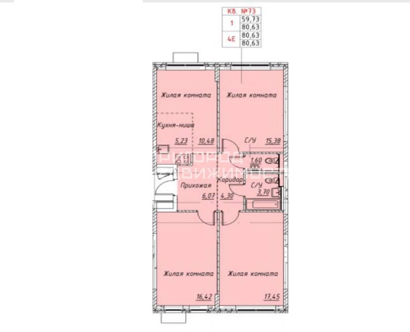 О квартире: квартира с высокими потолками h=3м и панорамными окнами. Общая площадь: 80,63 м². Жилая площадь: 59,73 м² (17,45+15,38+16,42+10,48). Изолированные комнаты позволят комфортно разместиться всей семьёй. Кухня-гостиная 15,7 м². Два санузла.